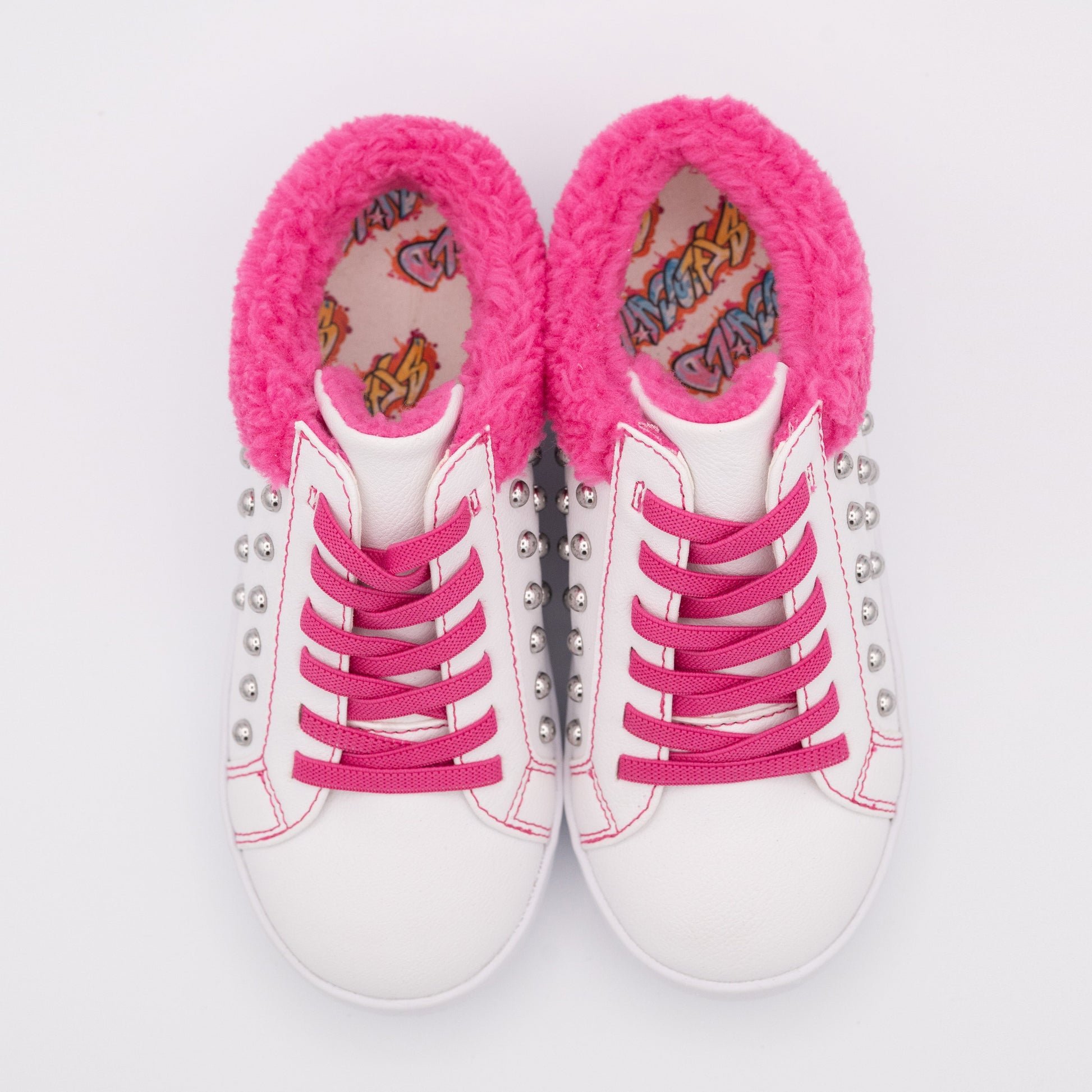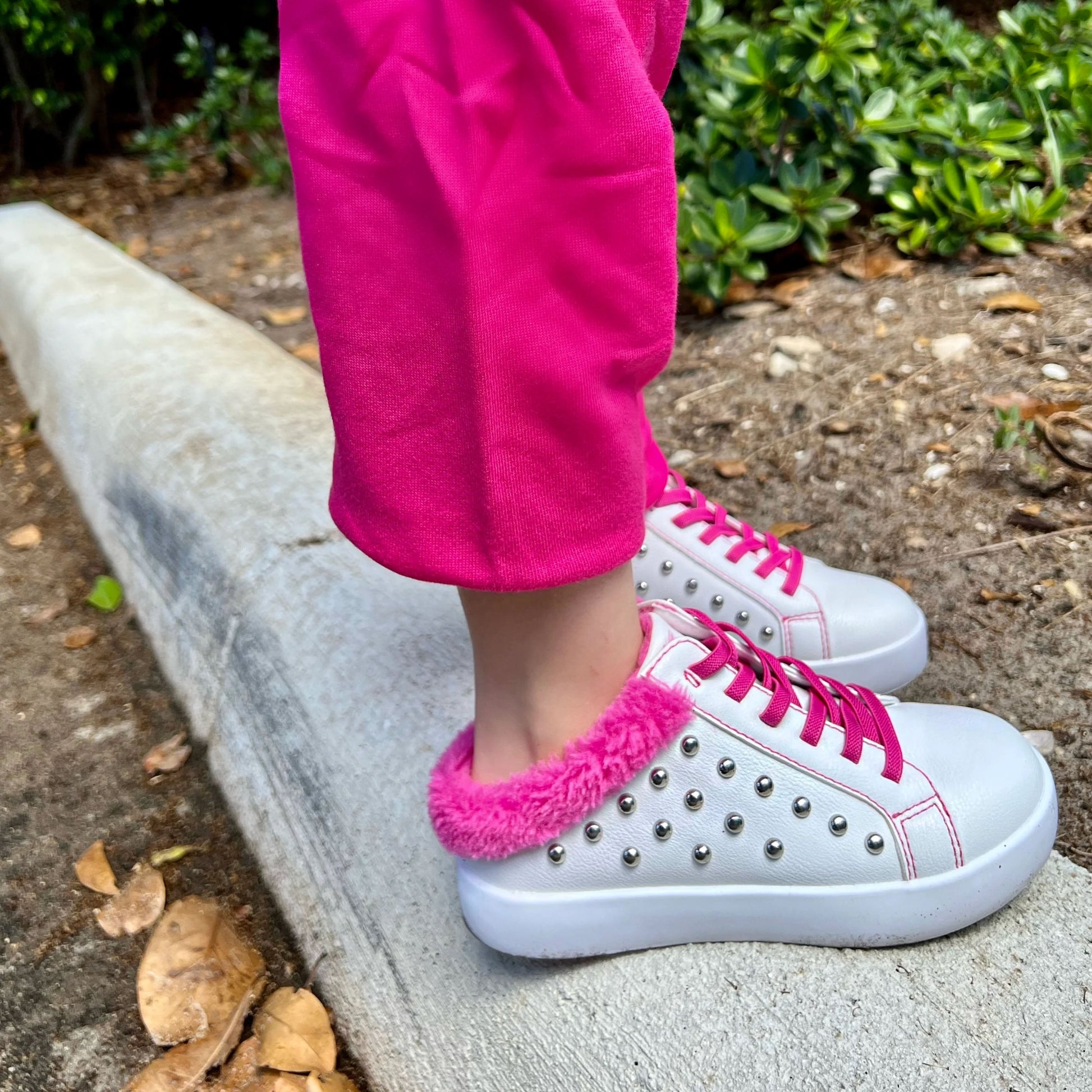 Get ready to fall in love with the Brooke Slip on sneaker! Perfect for both comfort and style, this slip on has silver studs on the side and a cozy Hot Pink fleece trim. Plus, with its breathable design and elastic laces for a secure fit, it's the ideal choice for your casual fashion sneaker needs.