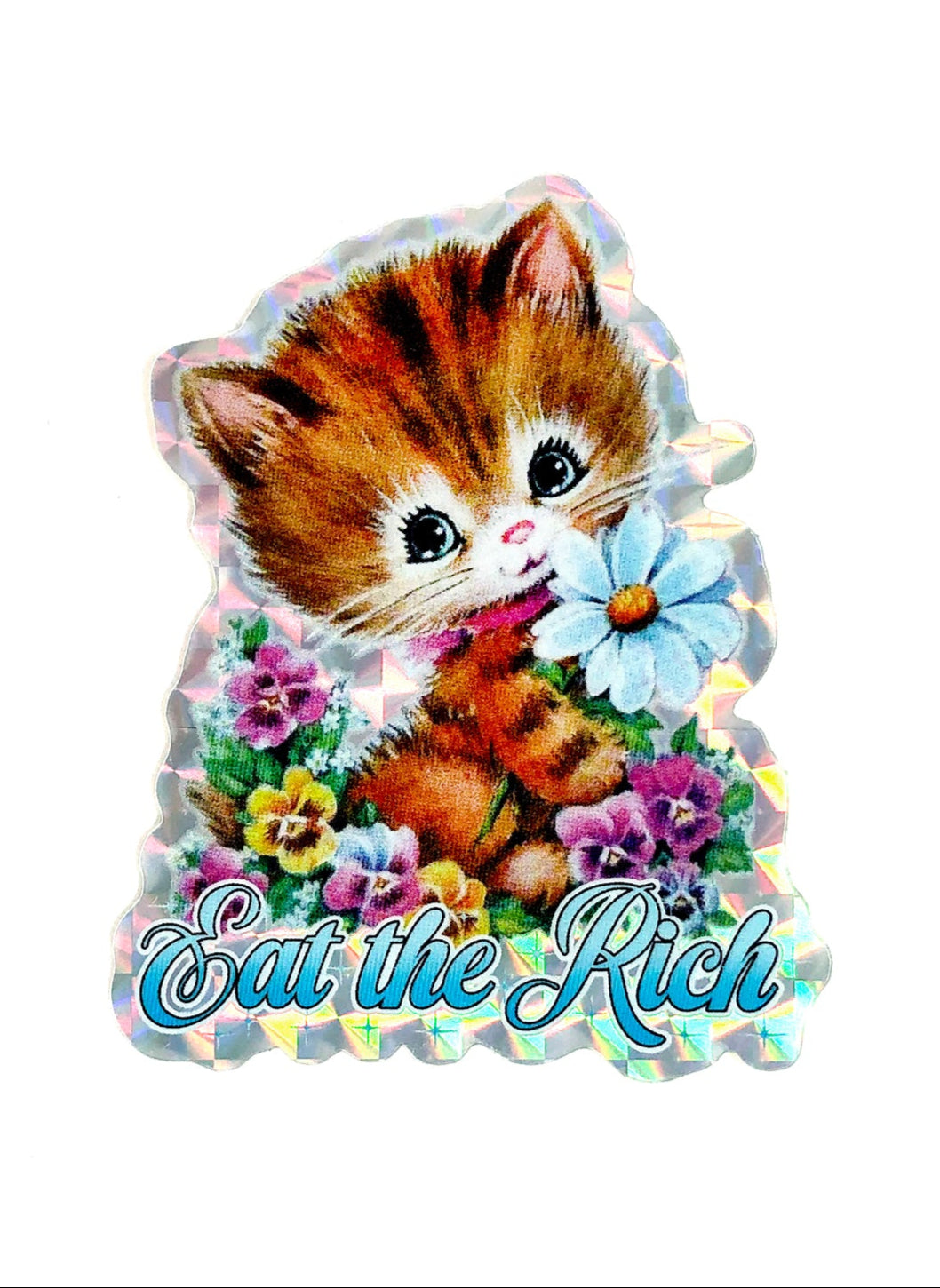 This wide-eyed kitten may be clutching flowers, but make no mistake—she came to redistribute wealth and knock over capitalism (and maybe a vase or two). Sparkly, snarky, and ready for revolution.