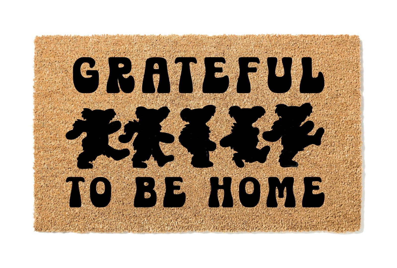 Elevate the charm of your front door with the well-crafted Grateful to Be Home Dancing Bears outdoor coir doormat by Homebound Society. Crafted with meticulous attention to detail, our custom personalized doormats add a delightful touch to any entryway. Each mat is lovingly handpainted with UV-resistant paint and features a non-slip PVC rubber backing for enhanced stability.