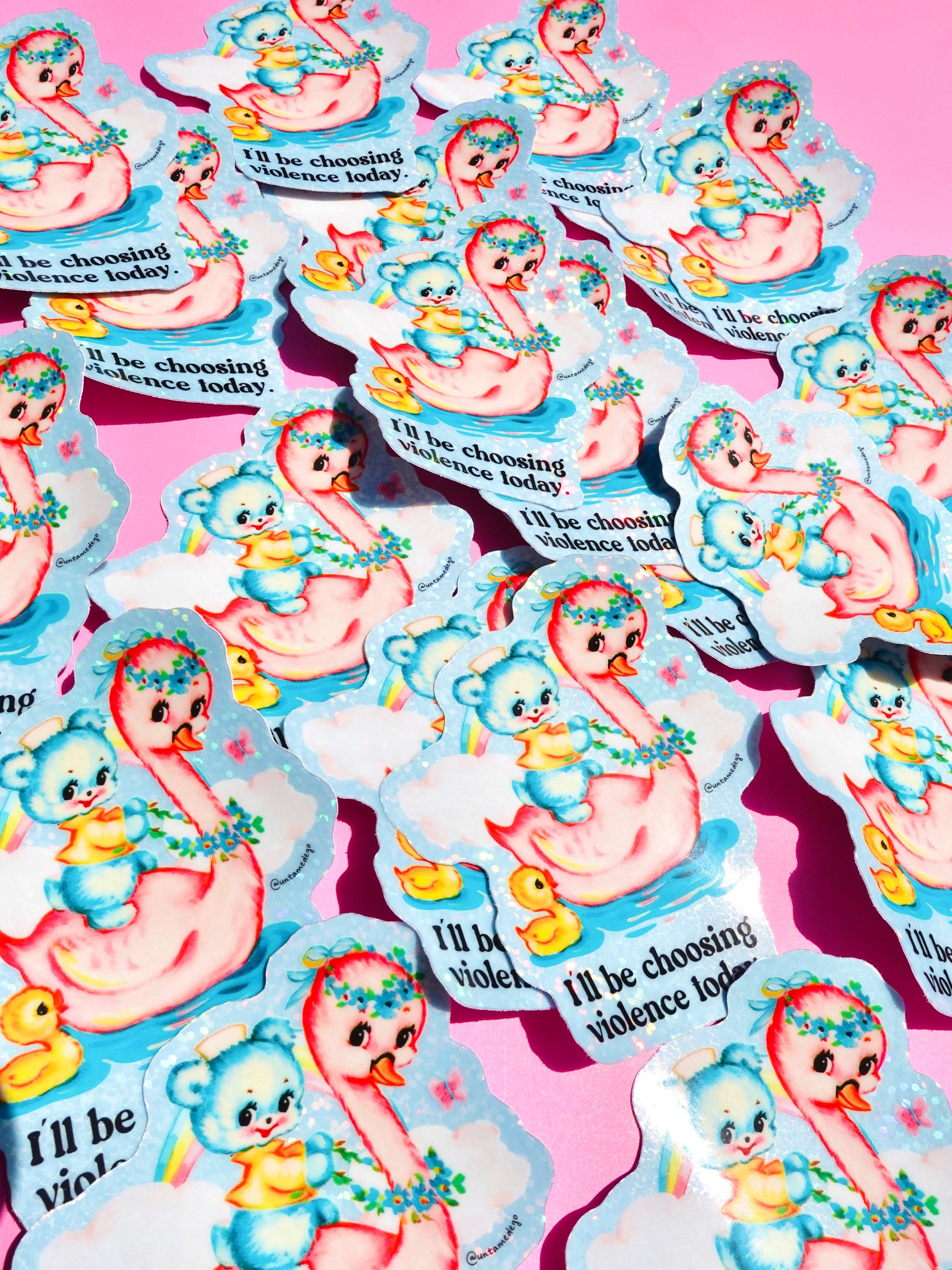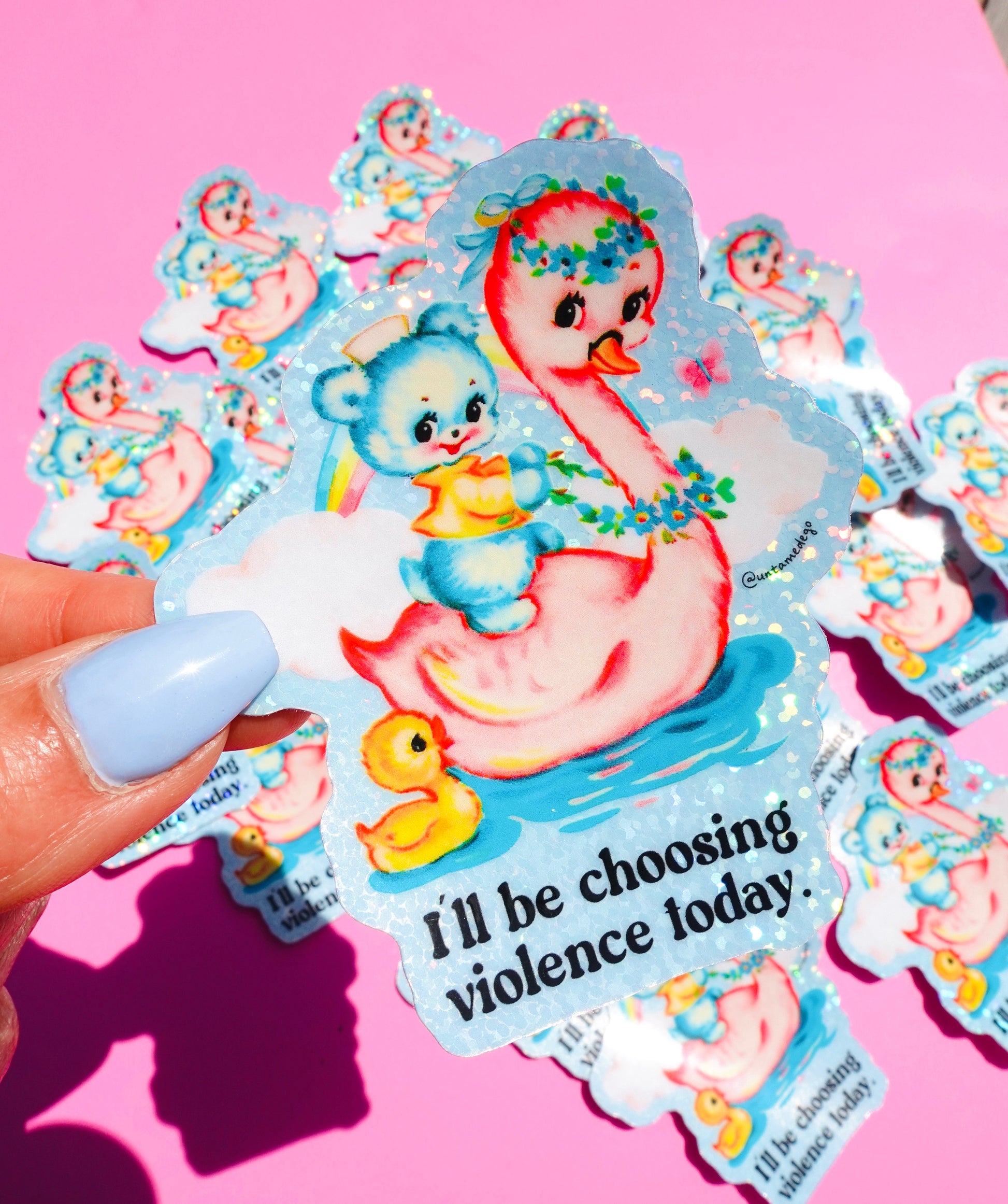 This funny vinyl sticker features a pastel duck and blue bear in the sparkliest act of passive aggression you’ve ever seen. Glittery, waterproof, and beautifully chaotic — it’s perfect for water bottles, laptops, trauma journals, and rage-fueled sticker books.