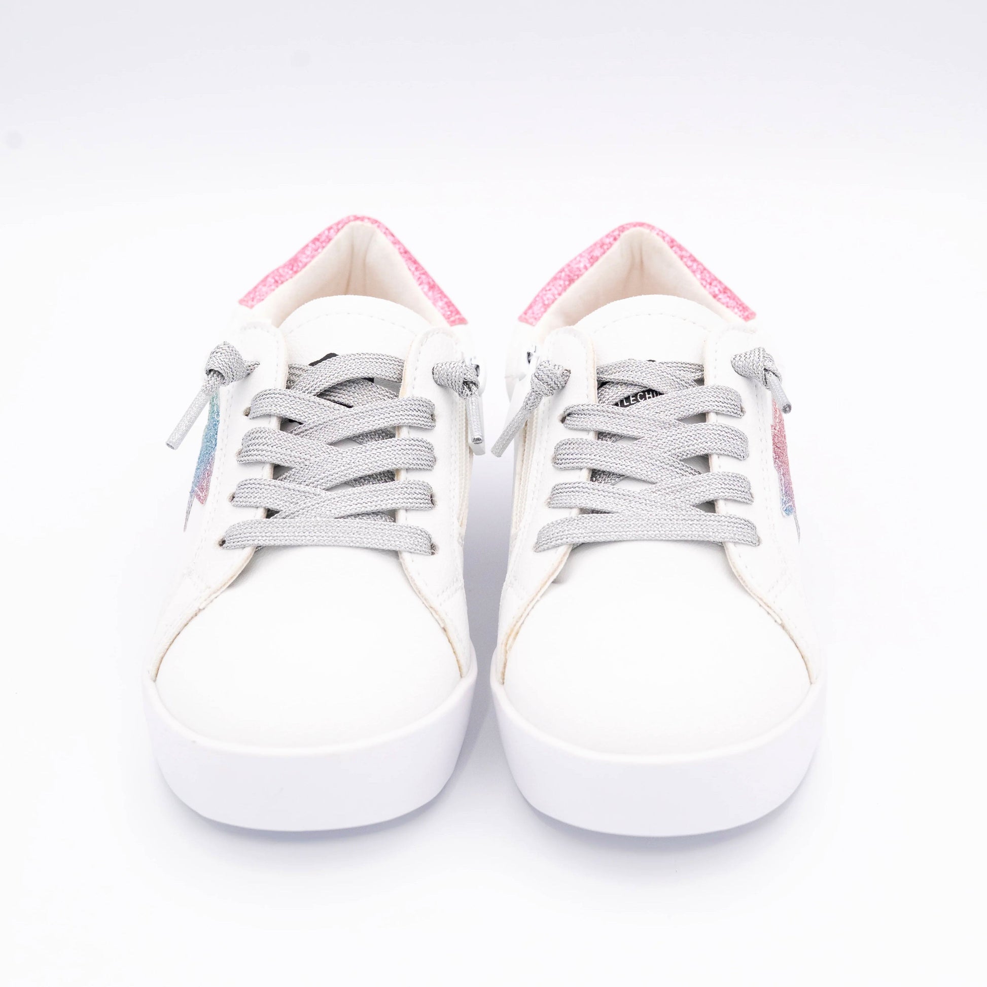Step out in style with the Jaymes, featuring a flexible rubber sole that moves with you for all-day comfort. The silver metallic adjustable laces add a trendy shine, while the inner side zipper makes slipping these shoes on and off a breeze. Each pair is uniquely adorned with pastel ombre rainbow star patches, giving your look a playful and one-of-a-kind flair. Perfect for those who love fun, fashionable footwear that’s as easy to wear as it is eye-catching.