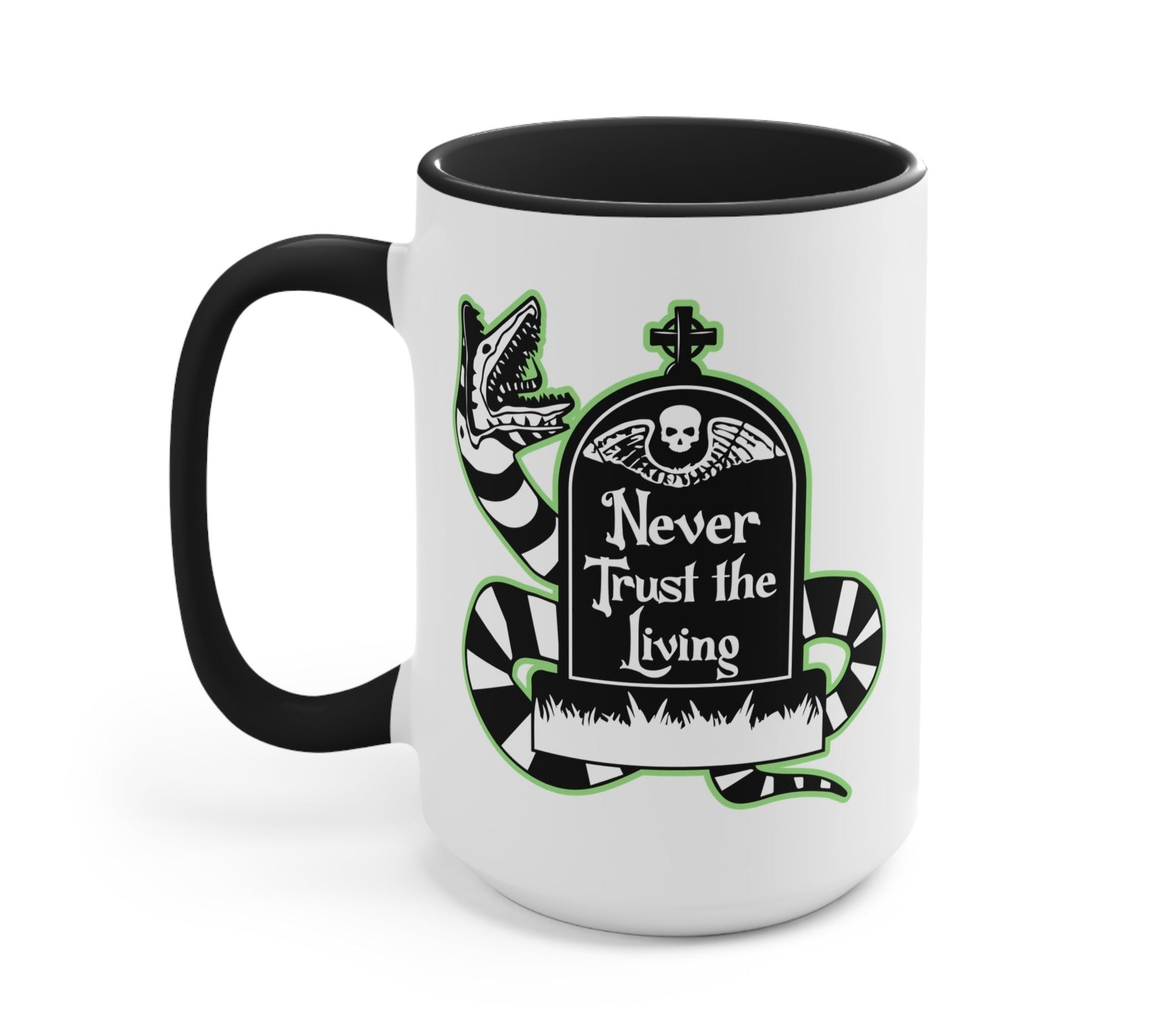 The deluxe size of the classic mug in white with a black handle. It looks great and is microwave and dishwasher-safe. Holds a generous 15oz. of your favorite warm beverage.