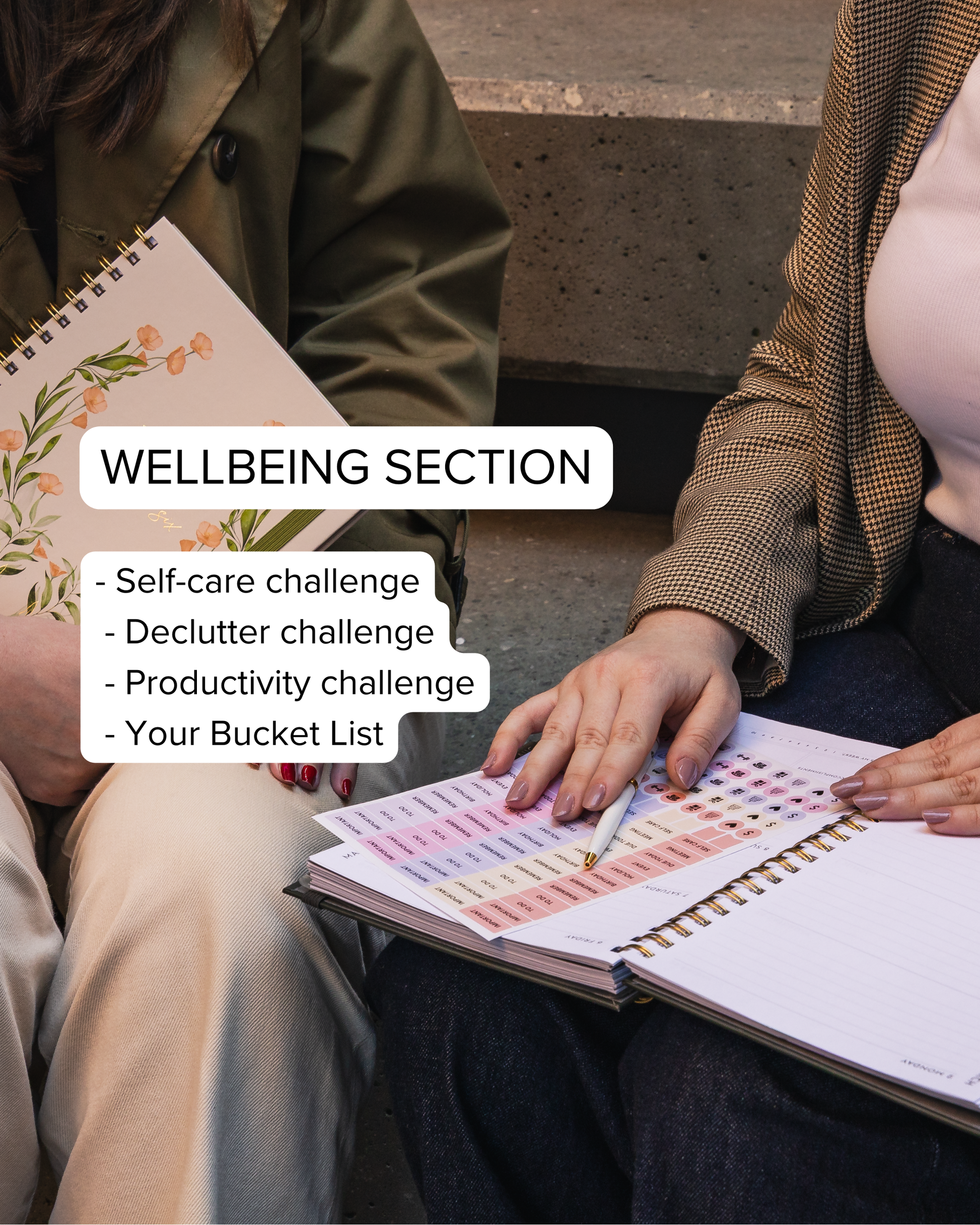 - Wellbeing Section: Includes self-care, productivity challenges and decluttering challenges, as well as a bucket list template